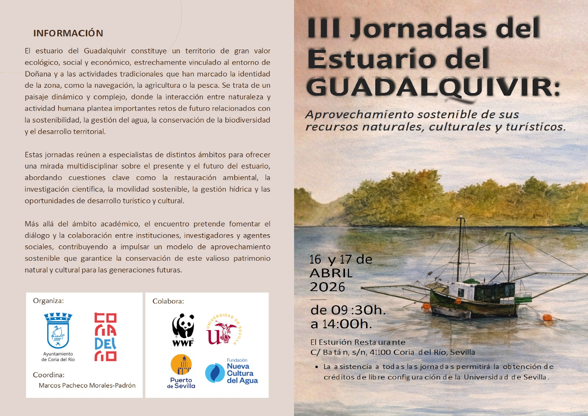 Coria del Río celebrará las III Jornadas El Estuario del Guadalquivir: aprovechamiento sostenible de sus recursos naturales, culturales y turísticos. Se trata de un foro de encuentro multidisciplinar para analizar y debatir el presente y el futuro del estuario, uno de los sistemas marítimo-fluviales más emblemáticos del sur de Europa.