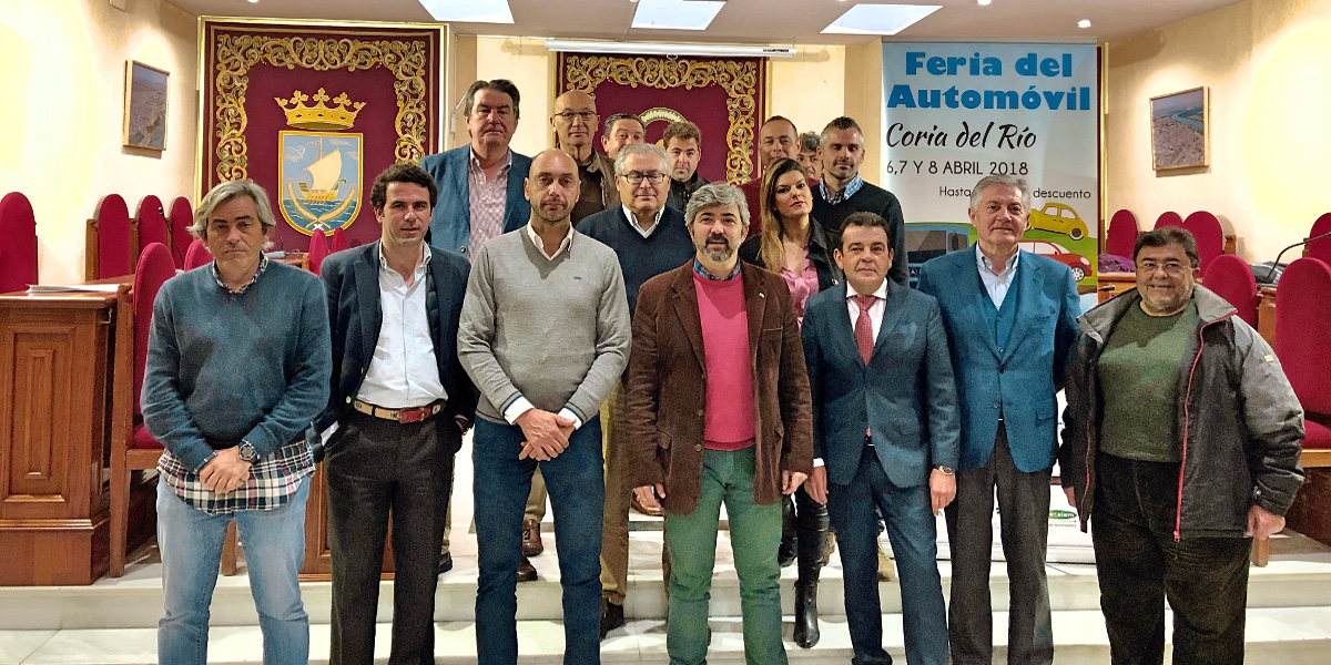 El alcalde de Coria del Río, Modesto González, el Delegado de Dinamismo Económico y Empleo, Francisco Gutiérrez y el director general de Grupo Berrocar, Manuel Berrocal, acompañados por los representantes del resto de firmas automovilísticas, talleres y entidades financieras, han presentado la Feria del Automóvil de Ocasión que se celebrará en Coria del Río del 6 al 8 de abril.