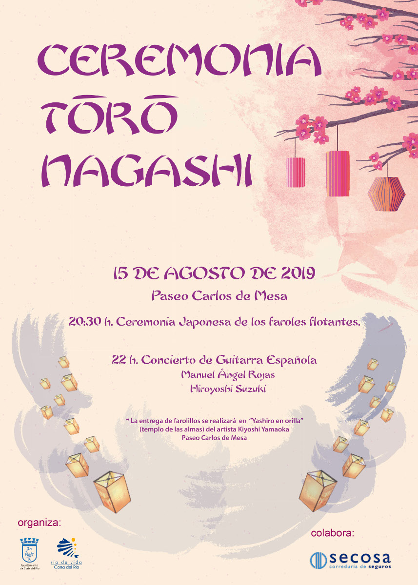 La localidad sevillana de Coria del Río acoge por tercer año consecutivo la ceremonia Toro Nagashi, una tradición japonesa para velar por las almas y desear la paz en el mundo que sólo se celebra, fuera de Japón, en esta localidad sevillana, y siempre con alguien nacido en el país oriental como testigo. Se trata de una ceremonia que se celebrará en el Paseo Carlos de Mesa y en la que se depositarán farolillos biodegradables al río Guadalquivir. Una ceremonia llena de espiritualidad, esteticismo y sentimiento nipón que tiene como eje el Yashiro en Orilla, conocido como "templo de las almas", levantado por el artista japonés Kiyoshi Yamaoka en el Paseo Carlos de Mesa, a orillas del Guadalquivir.